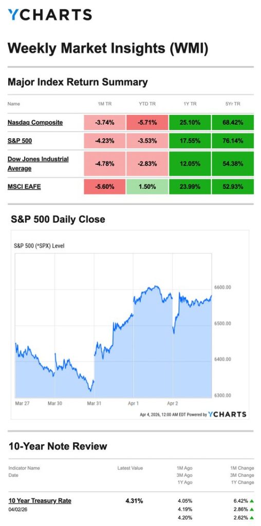 Source: YCharts.com, April 4, 2026. Weekly performance is measured from Friday, March 27, to Thursday, April 2. TR = total return for the index, which includes any dividends as well as any other cash distributions during the period. Treasury note yield is expressed in basis points.